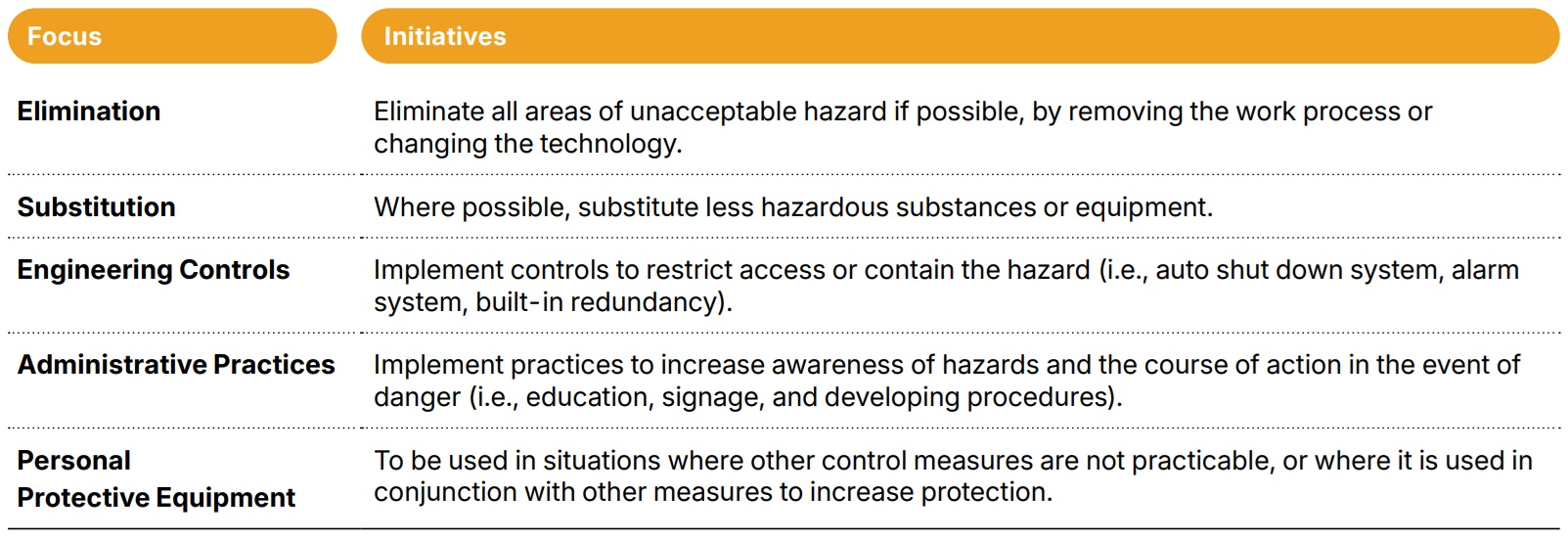 Upon receiving the report, the supervisor will begin investigating the root cause, conduct a risk assessment, and implement corrective actions. The assessment evaluates risks by severity and likelihood, while control measures consider legal requirements and codes of practice. Corrective actions are determined using the risk control hierarchy, with priorities and initiatives outlined in the table below.