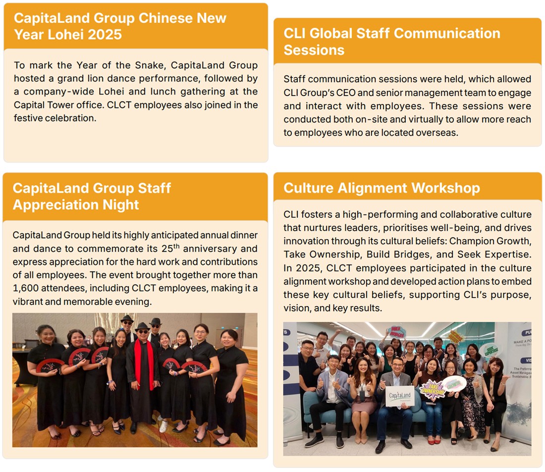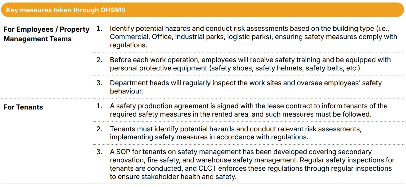 CLCT’s approach to health and safety is guided by CLI’s robust OHSMS. As a CLI-sponsored REIT, CLCT adheres to CLI’s EHS Policy, which outlines its commitment to managing OHS issues. This policy is communicated regularly to employees through meetings or other communication channels. Further details on CLI’s EHS Policy can be found on page 18 of this Report, or at https://www.capitaland.com/content/dam/capitalandinvestment/sustainability/esg_policies/CapitaLandEHSPolicy_CLIwebsite2025.pdf.