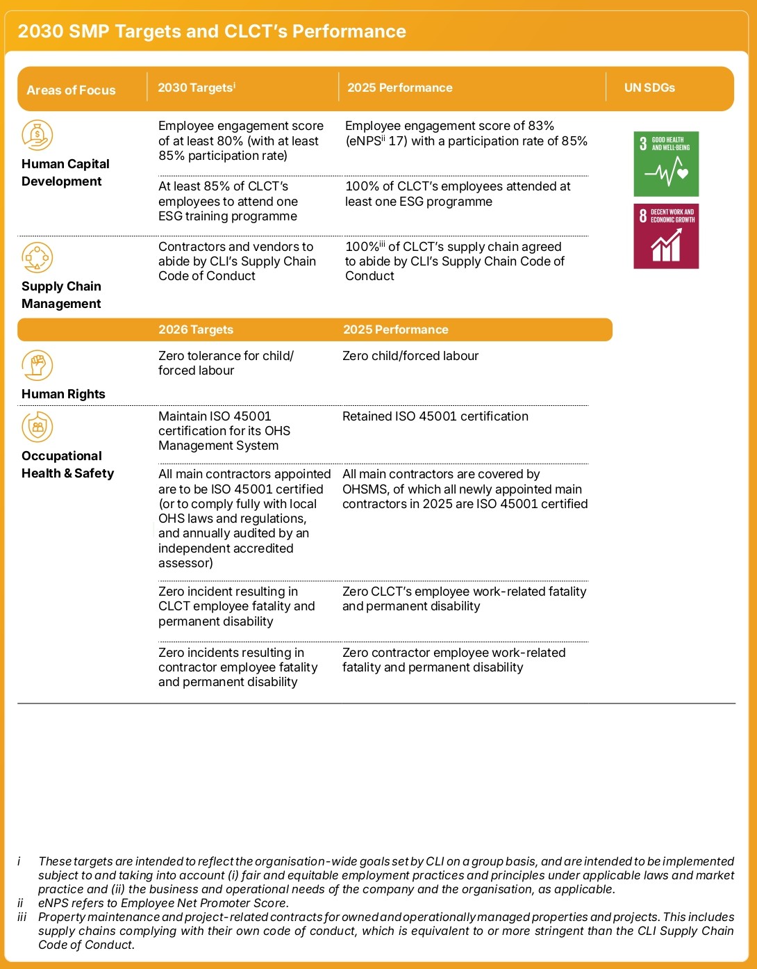 CLI’s contractor management guidelines require all contractors to comply with the CLI’s EHS Policy28, as well as local government and other legal laws. Contractors must train their employees on EHS measures and follow house rules such as the use of personal protective equipment and reporting of accidents. Additionally, tenants and suppliers must endorse CLCT’s Occupational Health Notice, outlining hazards and risk mitigation measures.
