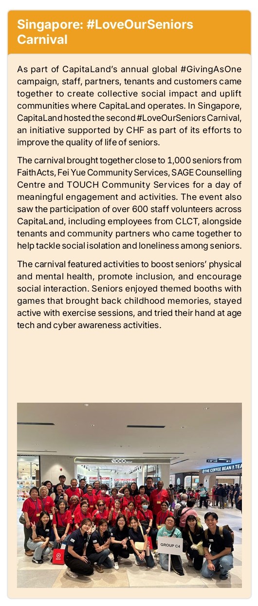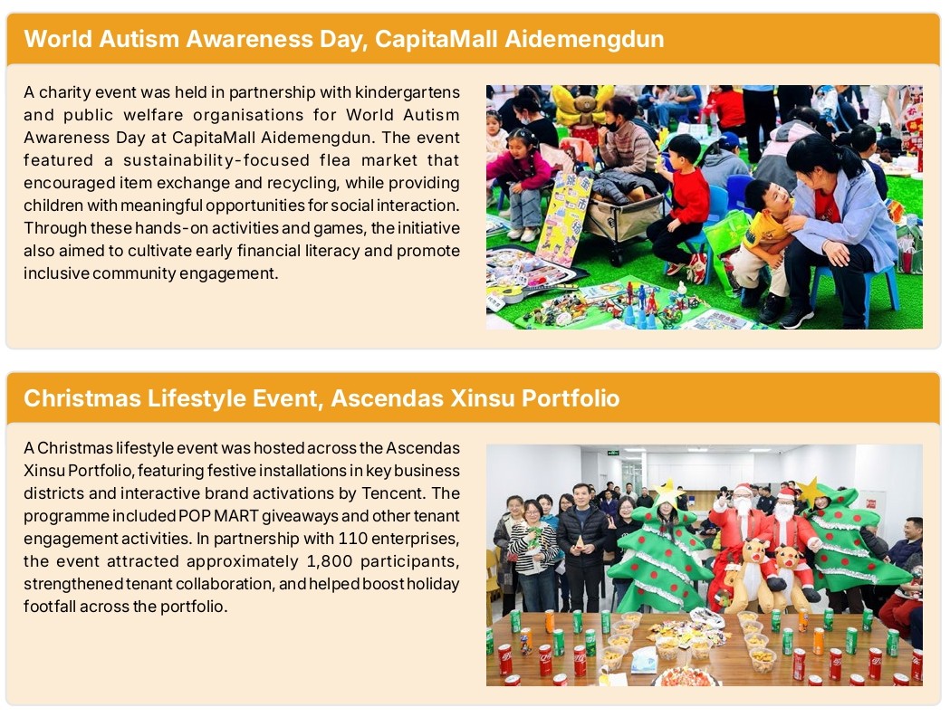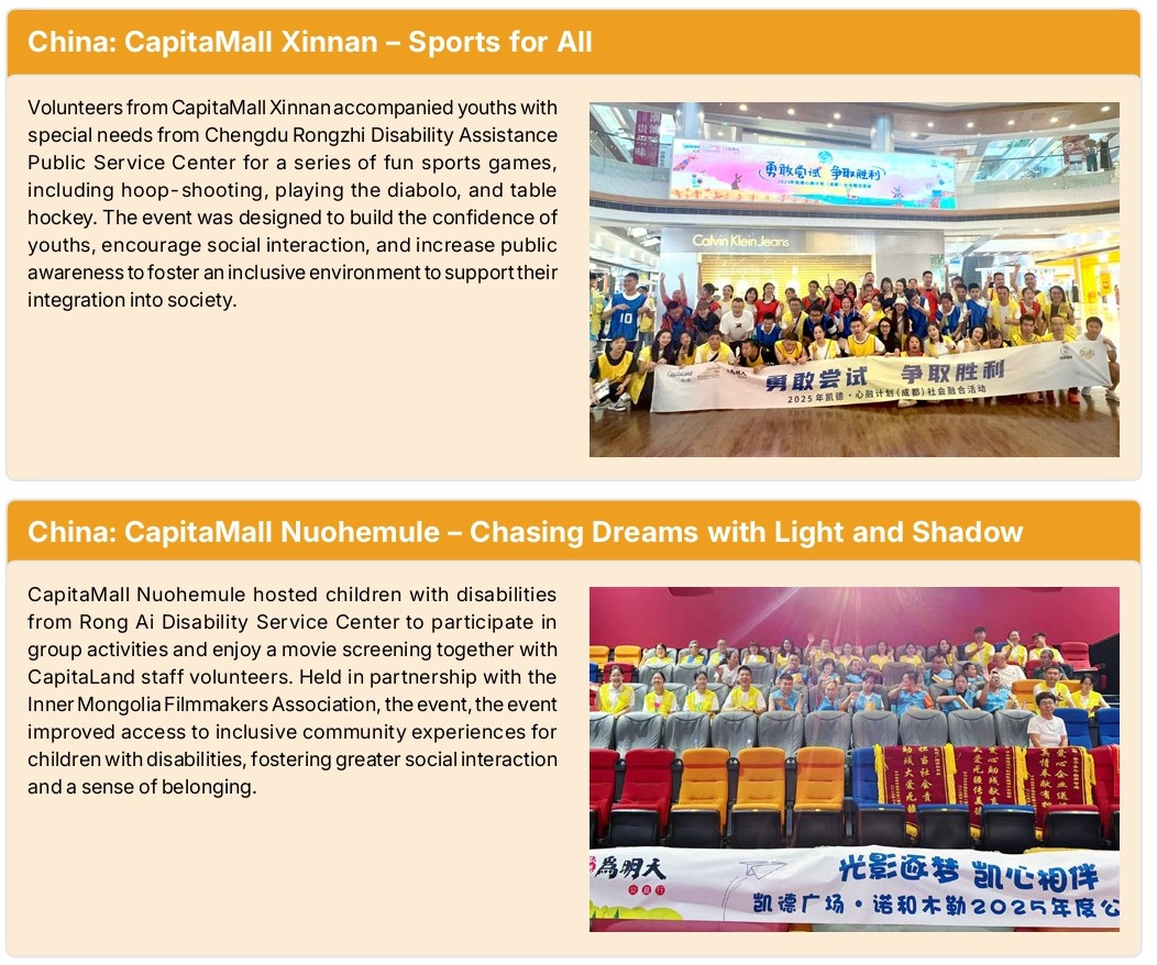 Our Sponsor, CLI, invests in local communities by identifying causes with stakeholders and involving employees. Through our philanthropic arm, CHF, we contribute towards building resilience in communities where CapitaLand operates, supporting education, health, and well-being initiatives, targeting children, youth, and seniors in communities where CapitaLand operates. In China, the CapitaLand AccessABLE programme partnered with 18 public welfare organisations to deliver over 270 activities across 13 cities in 2025, aimed at promoting skills development and social integration for children and youth with special needs. Four CLCT properties across China participated in the programme. These efforts benefited more than 4,600 children and youth, with the collective support of staff volunteers across CapitaLand, including employees from CLCT, and community volunteers who contributed more than 12,000 volunteer hours.